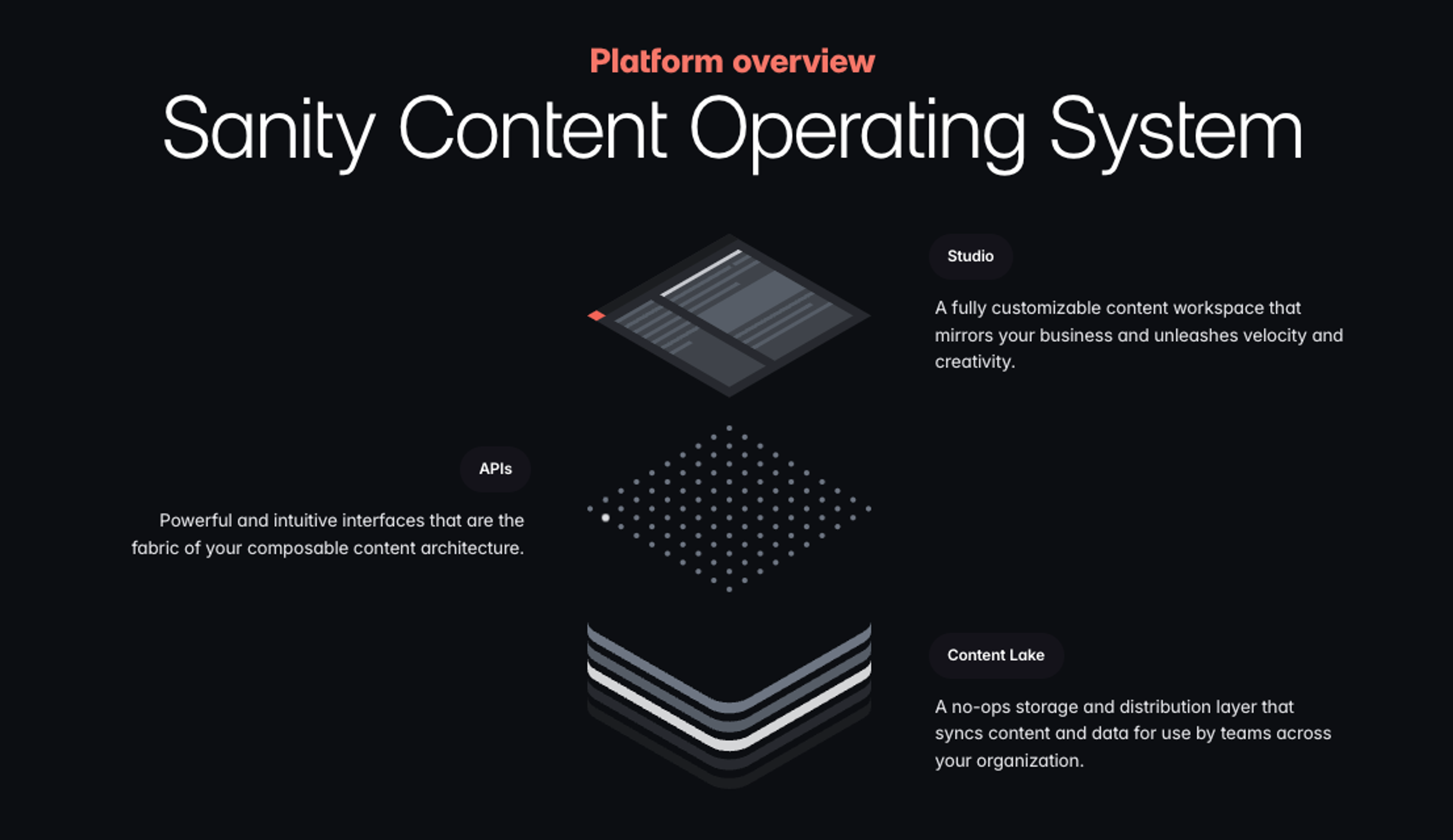 Sanity is the content back-end built for AI Content Operations. Reuse content seamlessly across any page or channel and bring your ideas to market without developer friction. With content treated as data and stored as JSON, the same reuse applies across your digital signage, chatbots, social, and more.