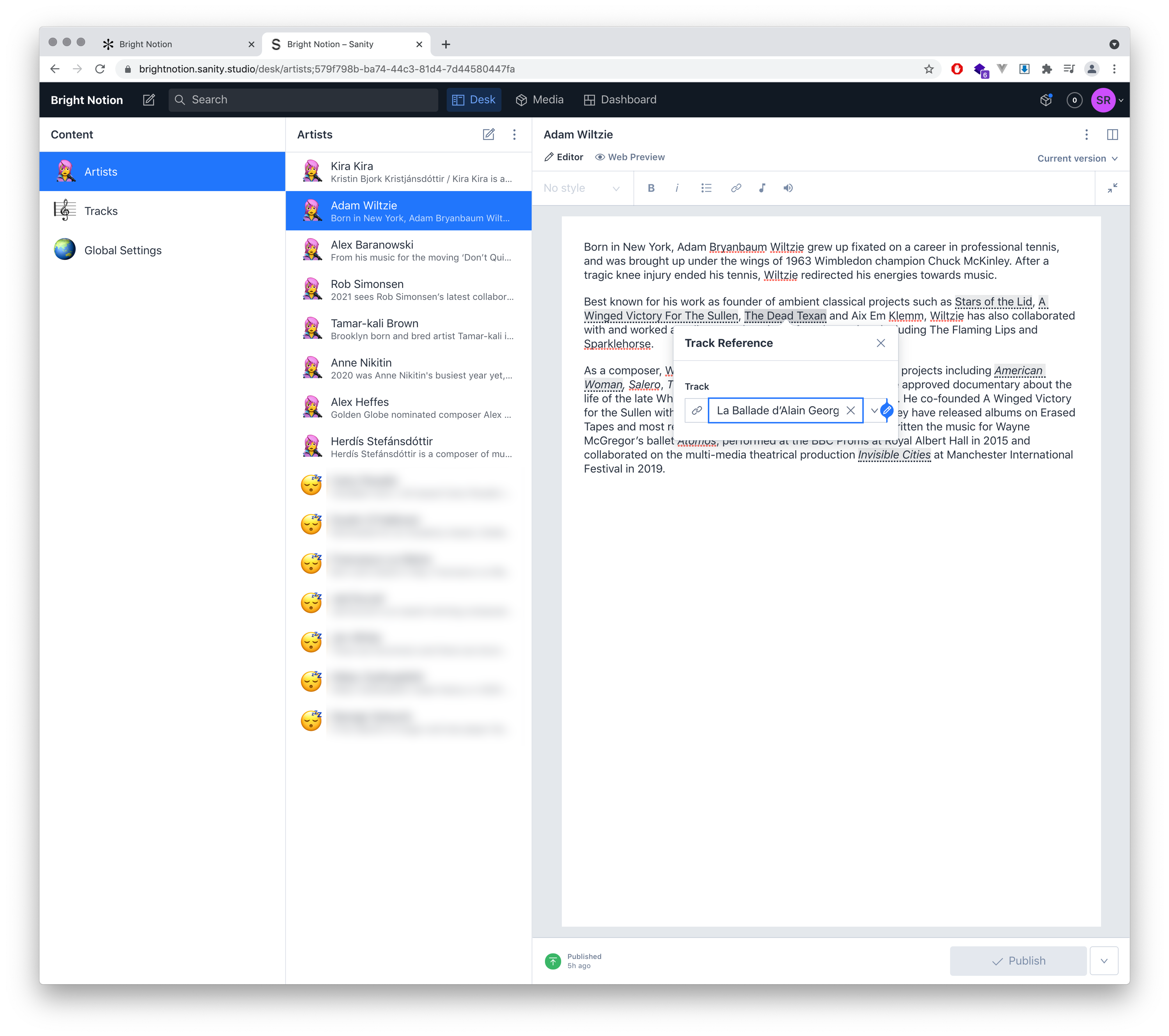 Checking out the Studio screenshots shared by Simon, we see how they organized the content and the awesome icons they added for the different document types. You'll even see in the rich text editor, how Tracks are referenced right into the block content. Great work, Simon!