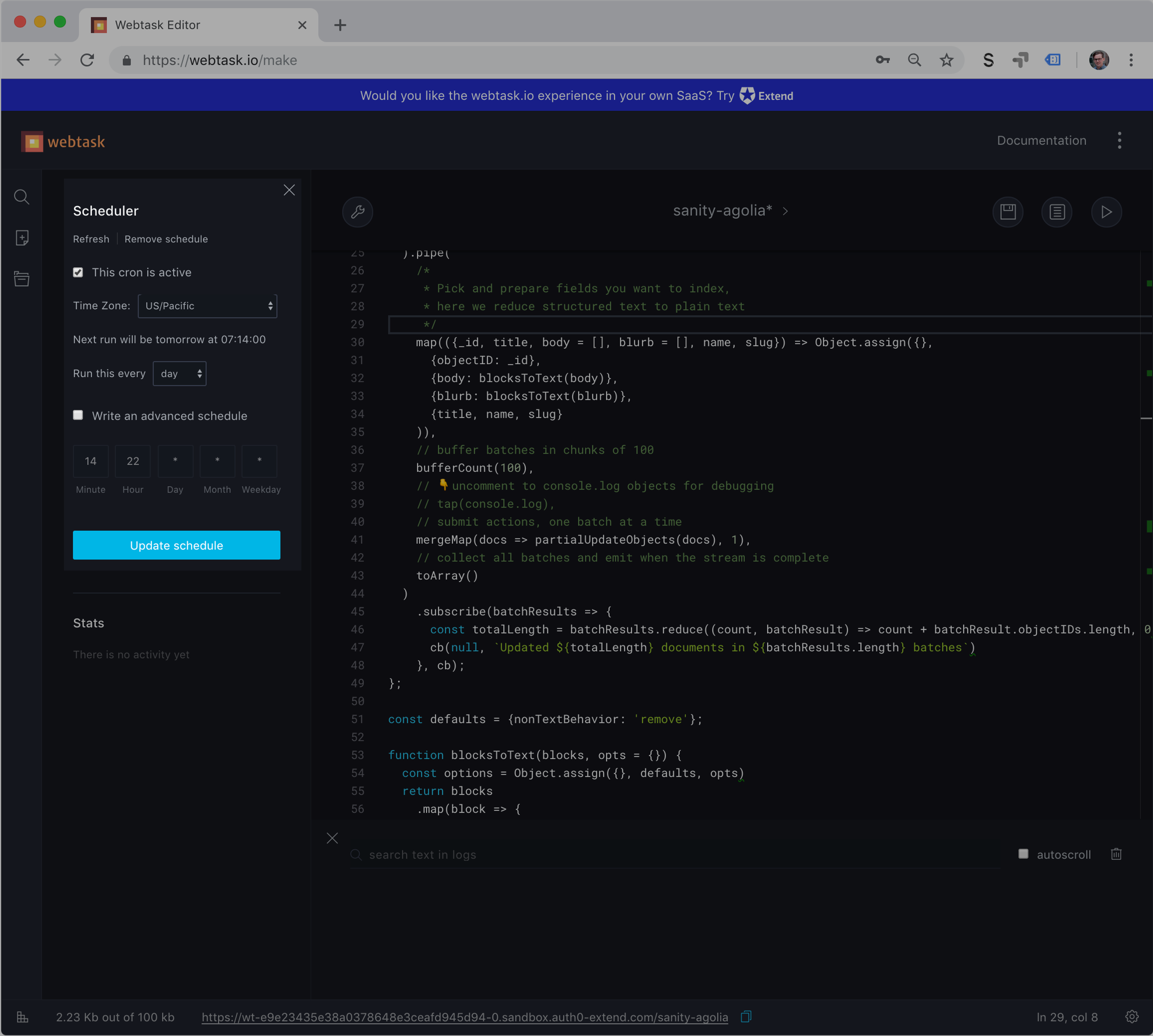 Algolia is a powerful search-as-a-service that makes it easy to provide weighted searches, statistics, and rich user interfaces for search for your frontends. Webtask by Auth0 is a service that makes it easy to build serverless functions right in the browser. In this tutorial we will look closer on how we can use Sanity’s export API to quickly get the content you want to index into Algolia using a scheduled serverless function.