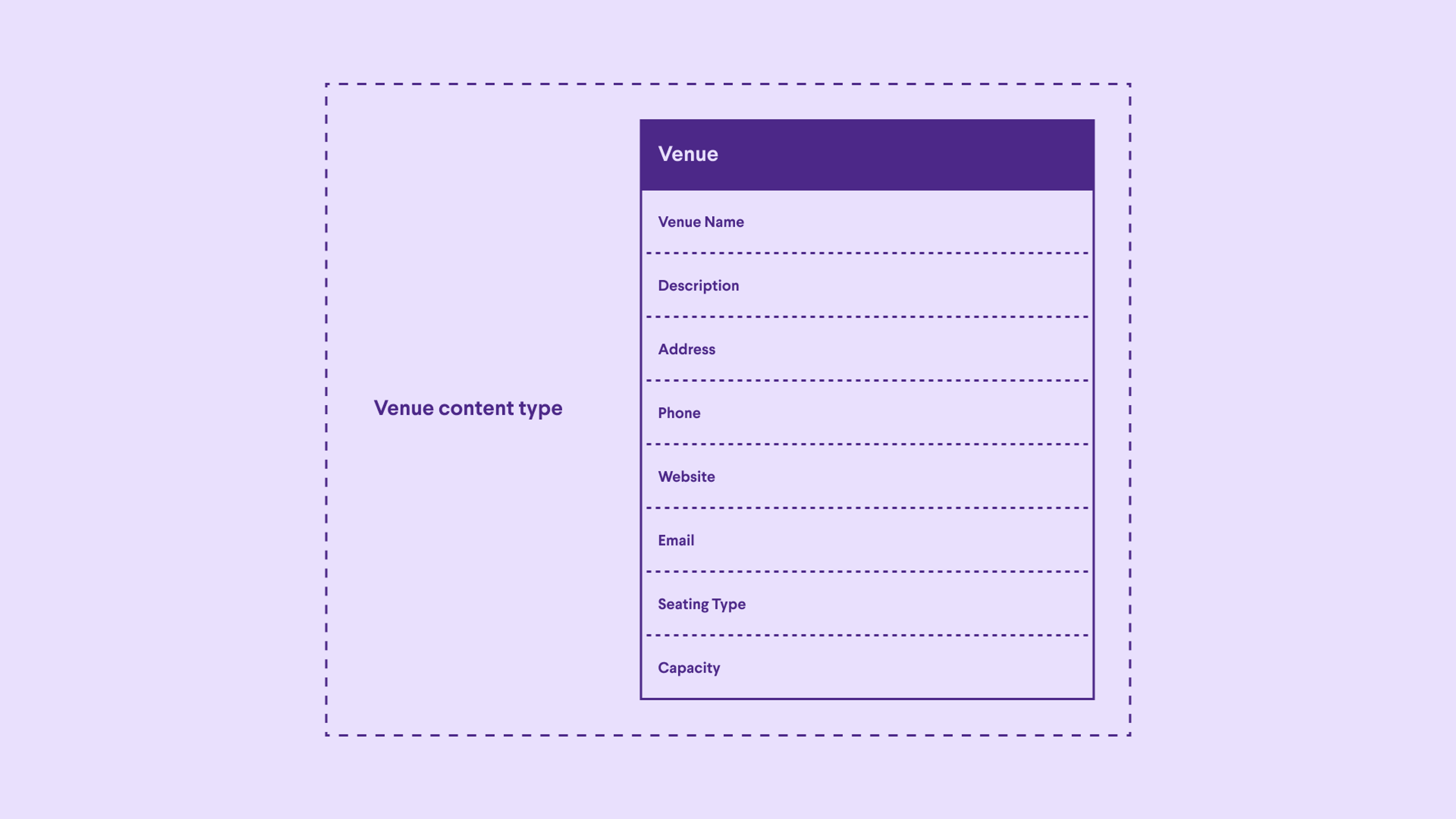 When you think of content types, think nouns. For example, a concert promotion and production company would include the content types venue, performance, act, and ticket.