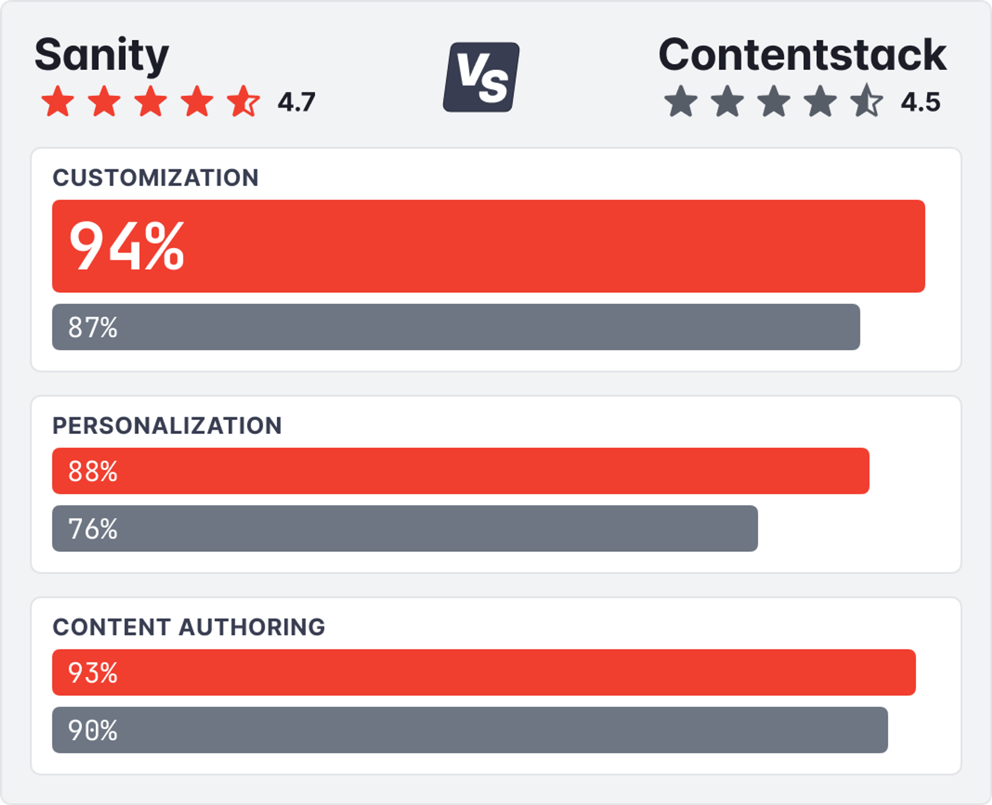 Hundreds of businesses like yours have rated Sanity more highly than Contentstack on G2 for factors such as customization, personalization and content authoring.