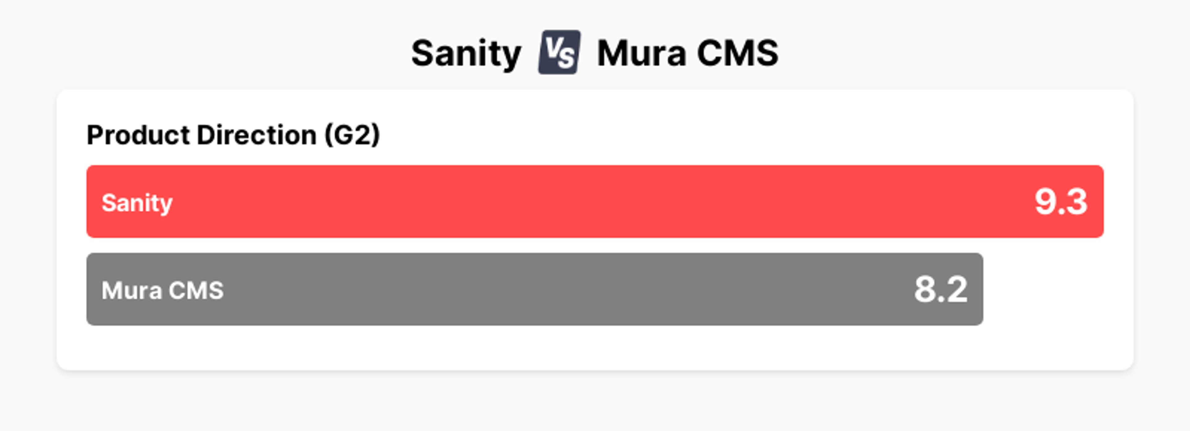 Sanity outperforms Mura CMS in G2 reviews, scoring a superior 9.3 in Product Direction compared to Mura's 8.2. This demonstrates Sanity's ability to provide a more intuitive and forward-thinking content management system. Choose Sanity to empower your team, fuel innovation, and expedite customer acquisition. Let Sanity be the driving force behind your content-powered growth.