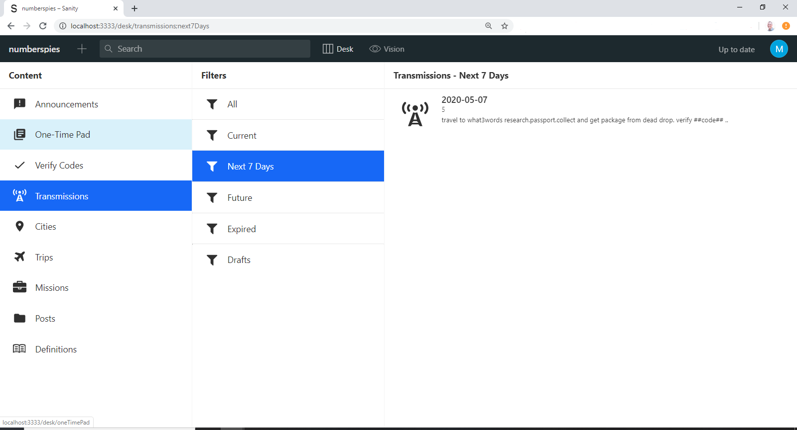 Number Spies is a game for Amazon Alexa where you decode messages, travel the world, and go on top secret missions. There is a companion website (numberspies.com) and a Facebook page.Sanity was used on this project to provide content to the Alexa skill that is used in text-to-speech (TTS) responses:
