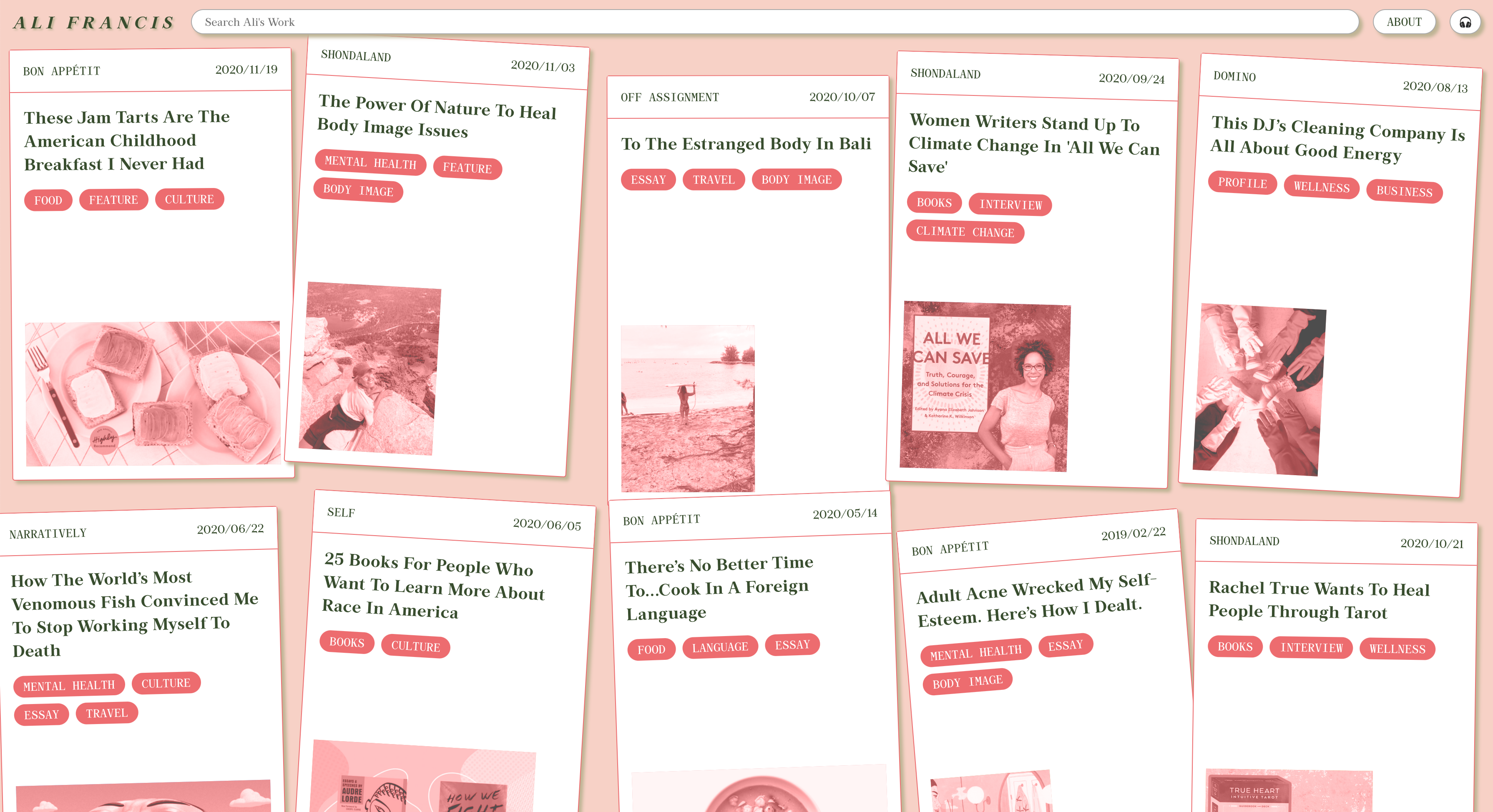 Joshie Fishbein shared the recently-launched portfolio site for author Ali Francis. The site features creative uses of CSS transforms, blend modes, and custom properties to make a creative and soothing experience that's unique on every reload.