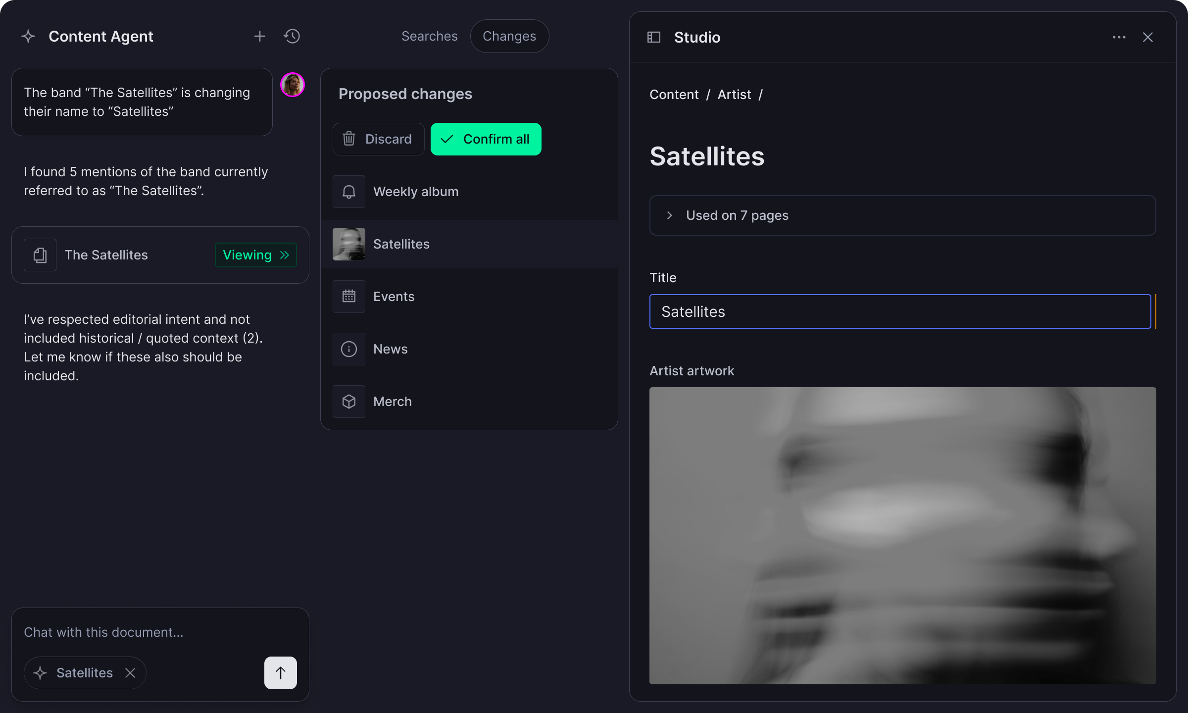This is because Content Agent is AI that understands your content model, navigates document relationships, and executes content operations at scale: auditing, editing, researching, and creating. And you stay in control. Every edit lands in the Changes panel for you to review before anything ships.