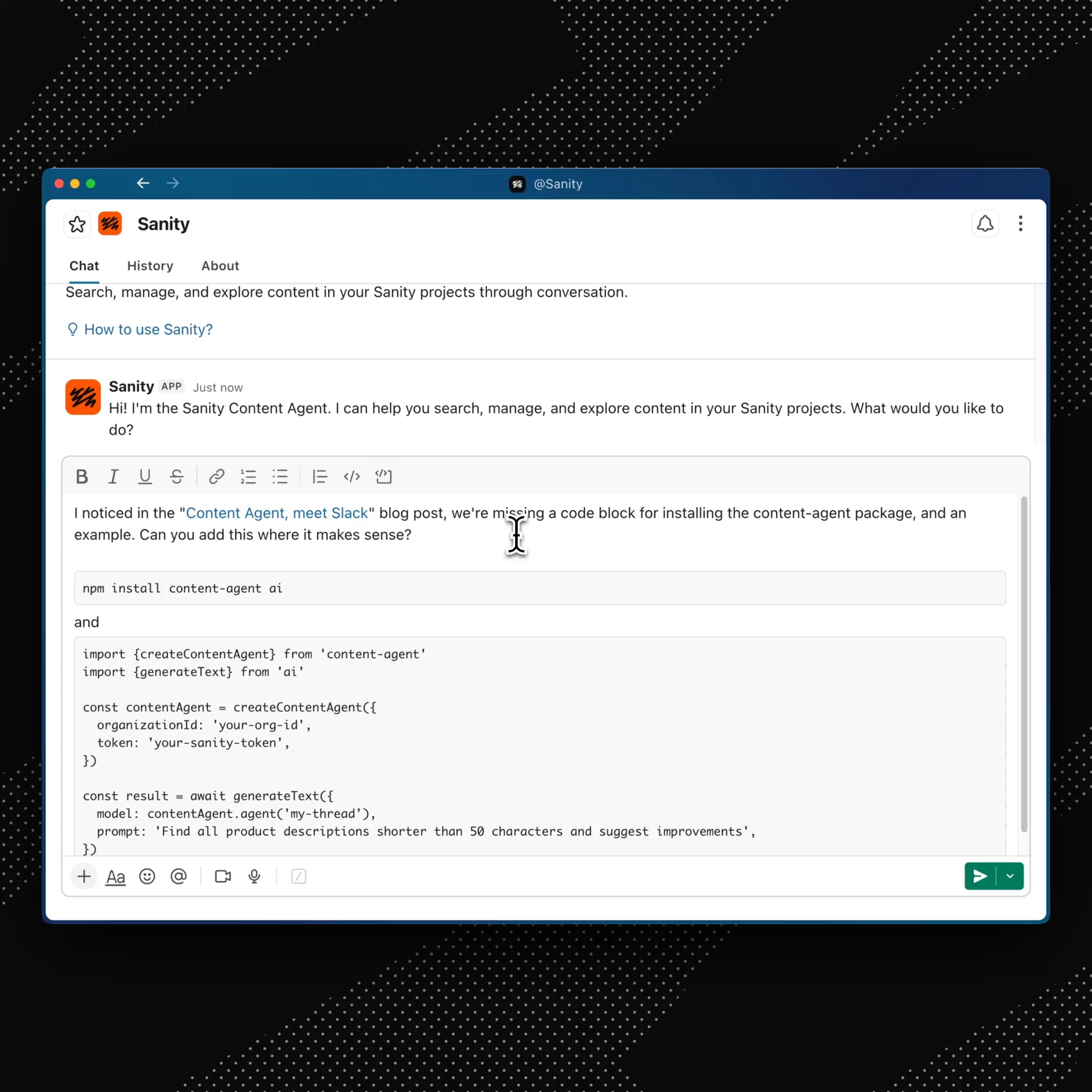 Until now, Content Agent lived in the Sanity Dashboard. Starting today, it works in Slack too. And for developers, we’re releasing a programmable API so you can build Content Agent into your own tools and workflows. (We’re submitting to the Slack App Directory for review. For now, use the install link.)