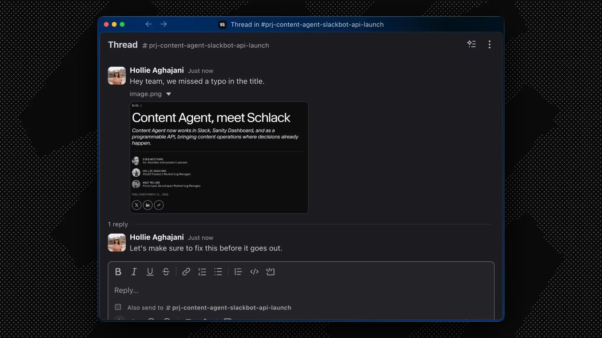 It reads the thread. Mention @Sanity in a thread and it sees the full conversation context, including screenshots and images. You don’t have to re-explain what you’re talking about. If your team has been going back and forth about a content issue for 15 messages, the agent picks up on that when it joins. This is what makes the difference between a chatbot you have to babysit and one that actually follows the conversation.