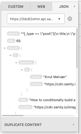 One of the advantages with using Sanity as a headless CMS is that it allows a team to work more cross-disciplinary. After the two minute installation, a developer and an editor can sit together and create the editorial interface, and have the fields and the modell pop up on the screen, ready for work. The content is available through the API instantly, and can be queried.
