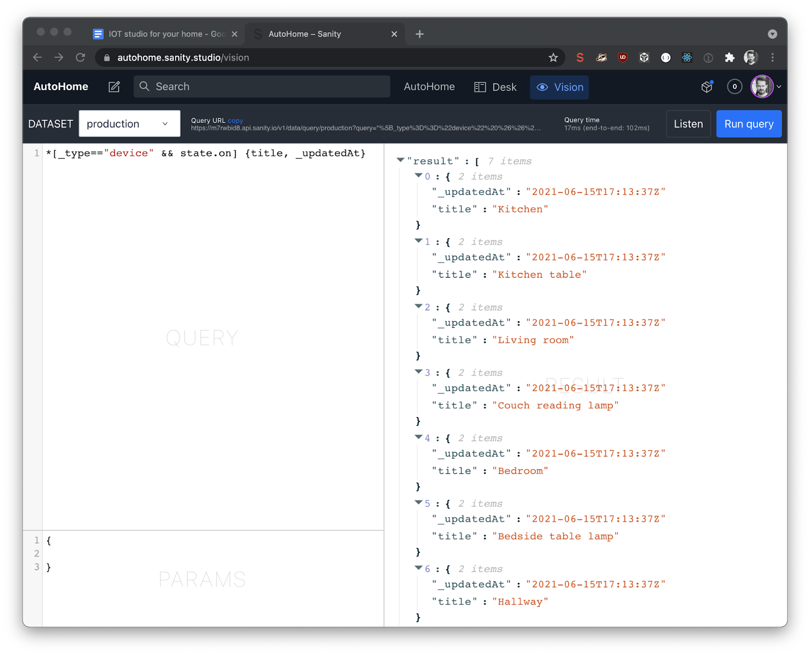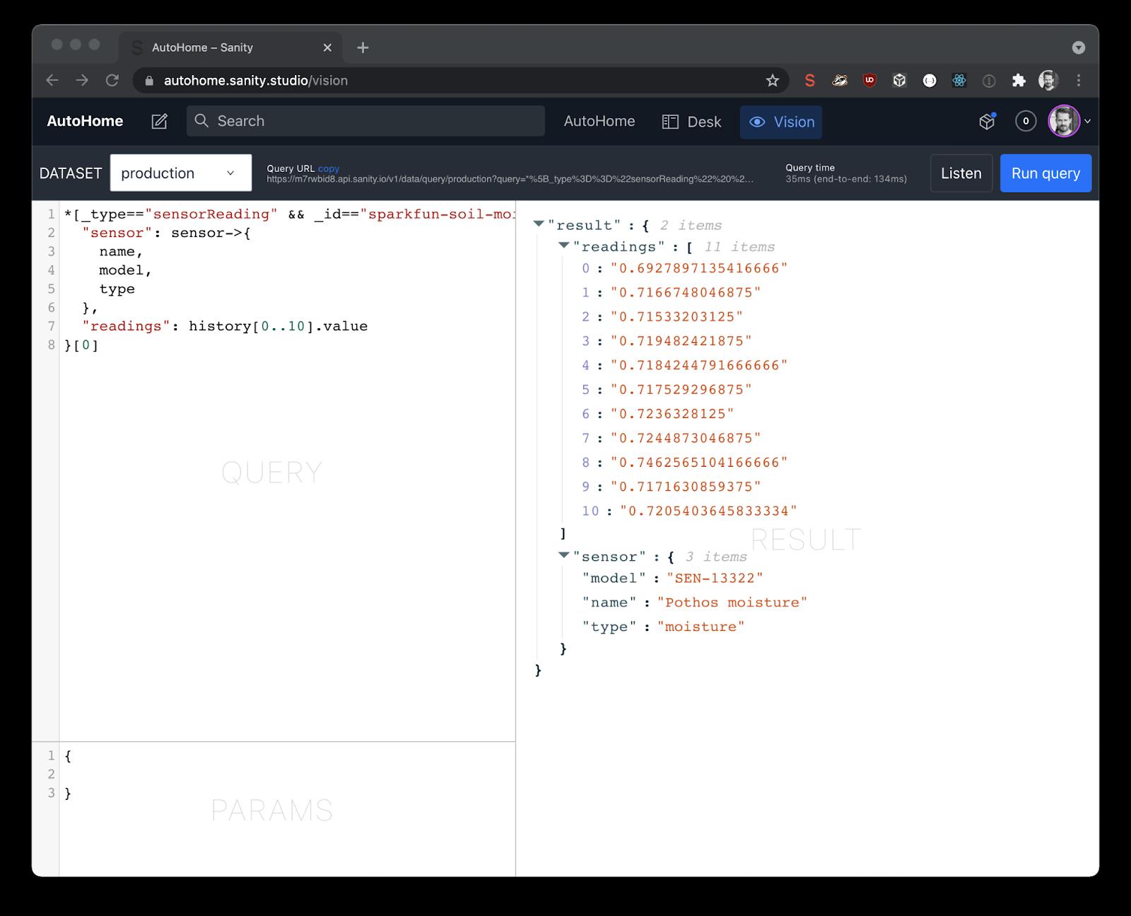 When using the Sanity content lake for integrating data from all your home automation sources you will also be able to use GROQ to do queries to get answers to all the stuff you want to know about your home. For example, easily query how the soil moisture in your favourite house plant has developed for the past 24 hours.