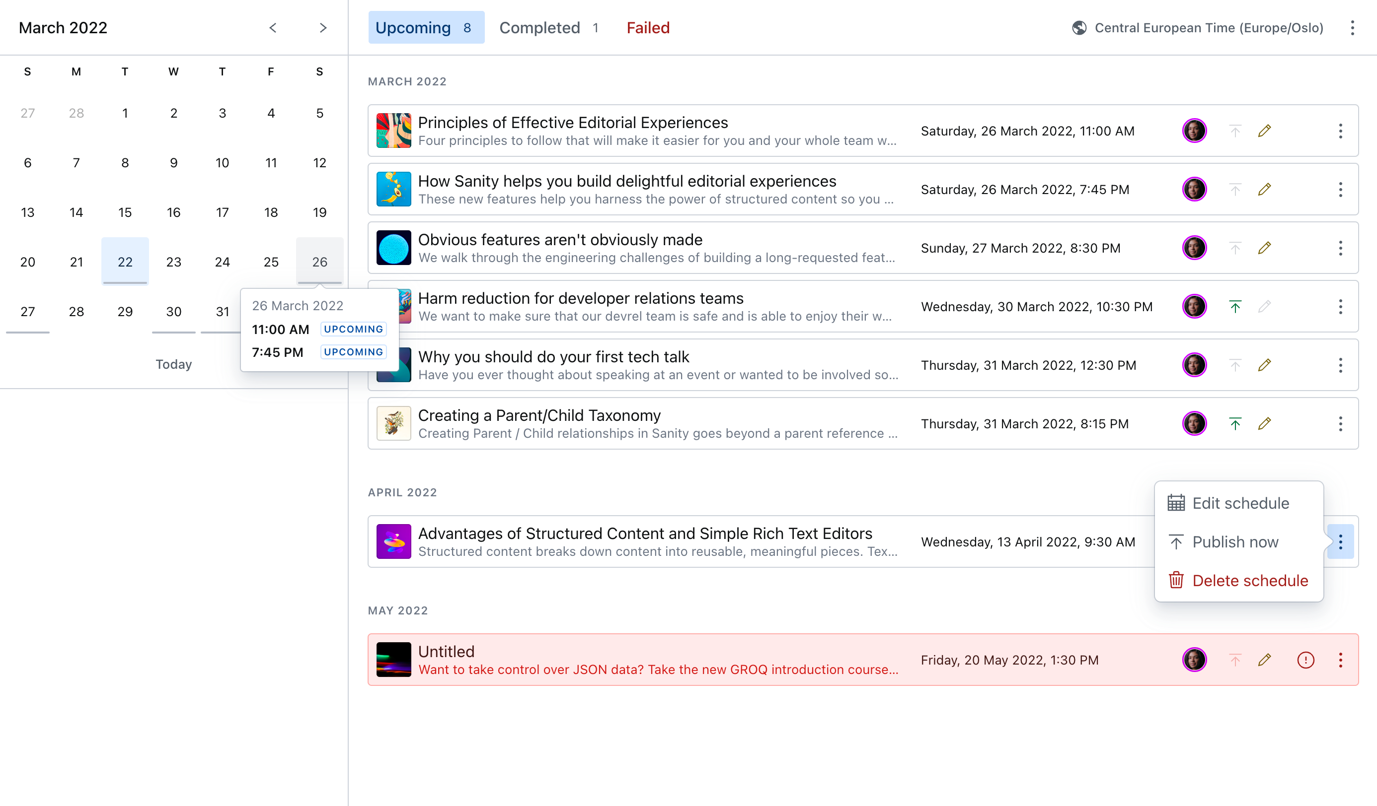 A standalone Schedules tool that gives your team an overview of upcoming documents that are slated to be published and the ability to filter them by time and status. It also provides context on who scheduled the document and when it was done.