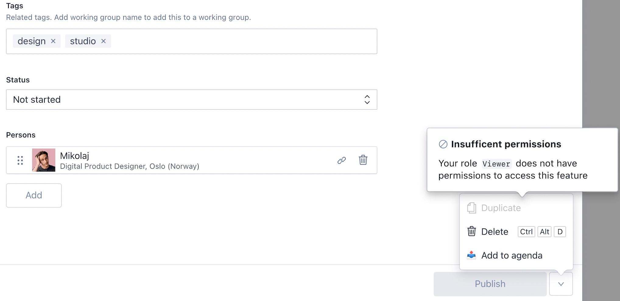 Our new Roles system provides out-of-the-box features to control access within the Sanity Studio. It has a new set of default roles that cover most of the use cases for content control. And we're releasing a new version of Sanity Studio that has built-in detection of a user's role, automatically controlling access and actions a user can take with specific content.