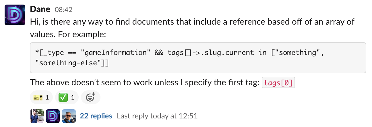 Additionally, anything that happens on Slack, stays on Slack. If you are not part of our Slack community, you are literally missing out on thousands of helpful threads and a vast community of developers that could answer your question. This may read like an ad to come and join sanity-io-land (and why not, please join!), but the point here is that nothing is available outside of Slack. To make matters worse, Slack applies a 10,000-message limit on its generous free offering, meaning that even if you are a member, you will miss out on any answers that lie beyond the 10k horizon. And because the community is growing, this limit is a smaller time window every month. Today, it means having search access to roughly 7 weeks of history.