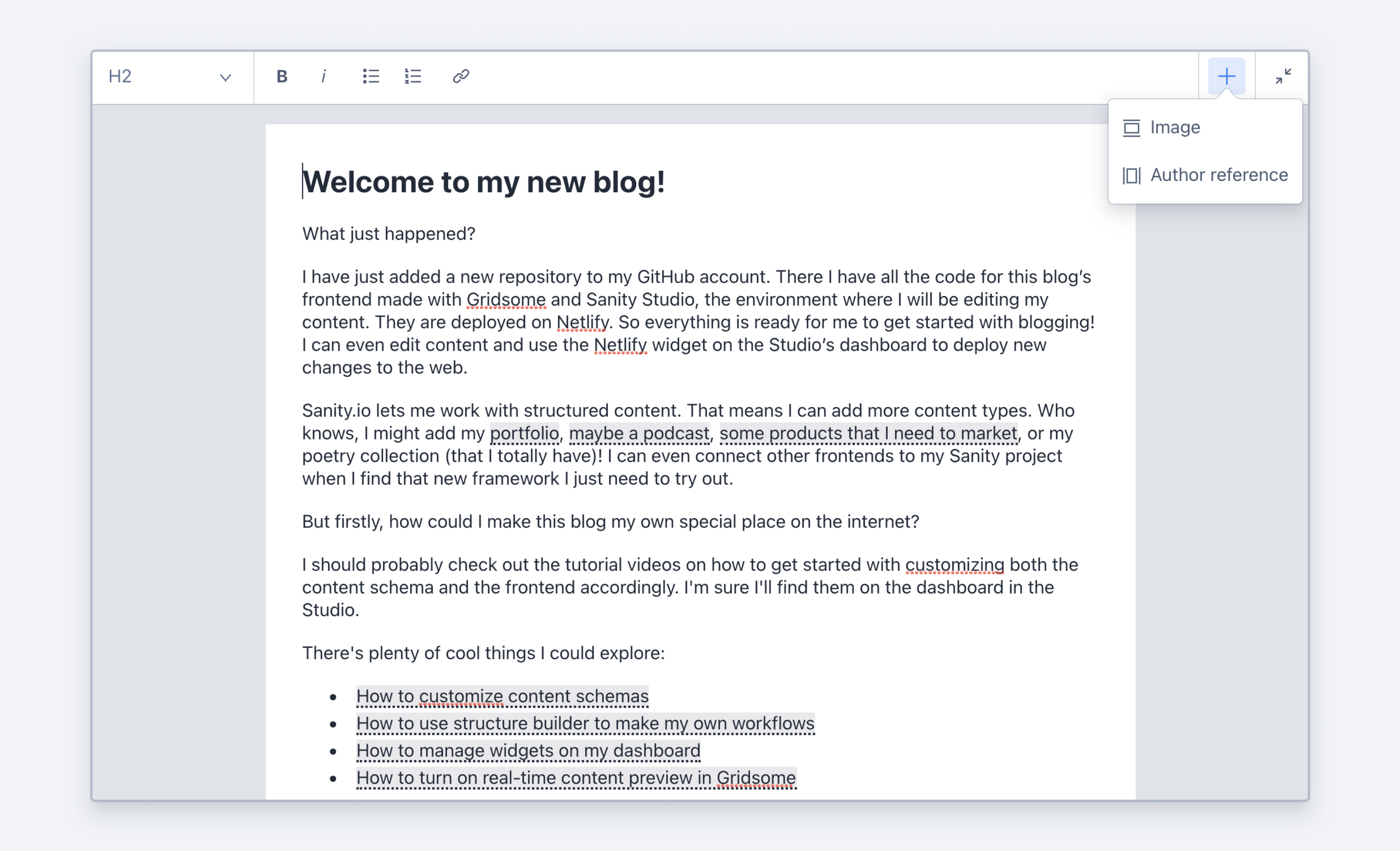 The block text type supports block styles, lists, decorators (bold, italic, etc.), custom content types (embedded objects), inline objects, and even marking up text with arbitrary object data (annotations). Learn more about how to configure the rich text editor.