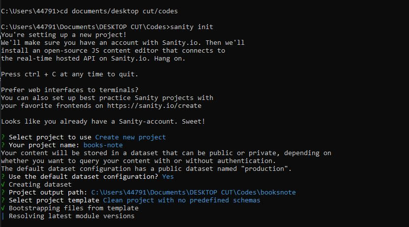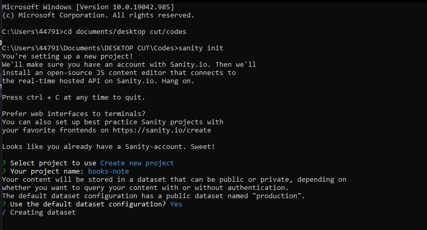 Once that is done, Sanity prompts you to create a new project. Tap Enter. Name your project books-note and choose the default dataset configuration by typing Y.