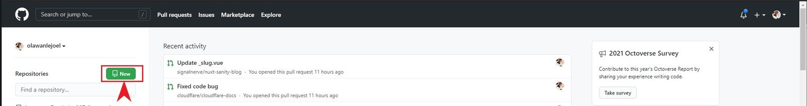 First, let's create a repository on GitHub by clicking the New button or the plus on the top right corner.