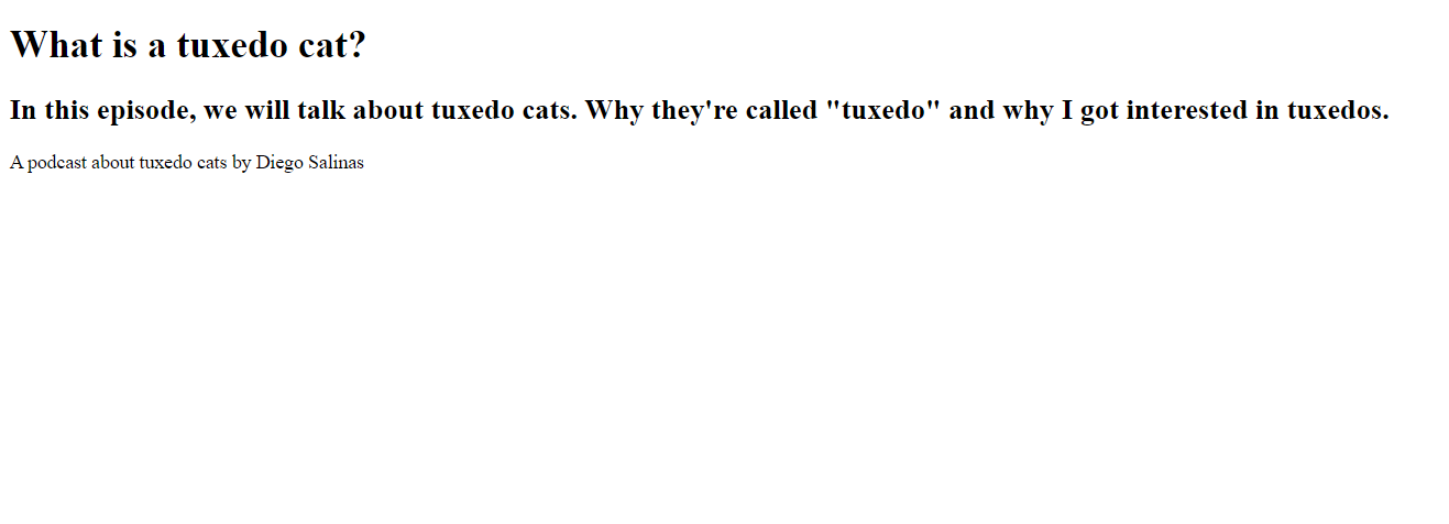 Go to the /episodes/slug URL of your dev server, where you replace slug with the slug you previously inputted into Sanity Studio for your episode. For me, that was tuxedo-cat.