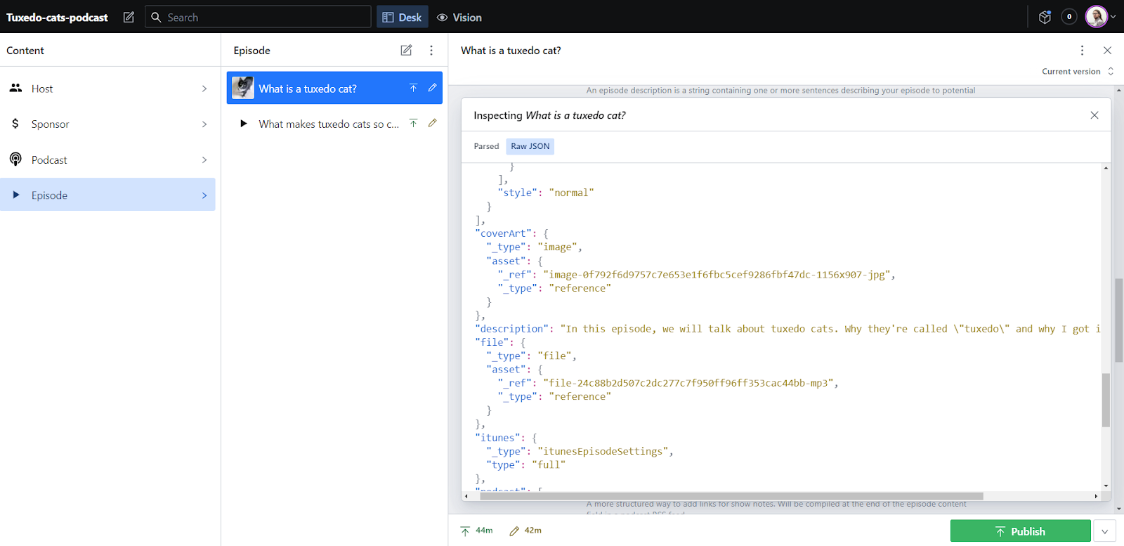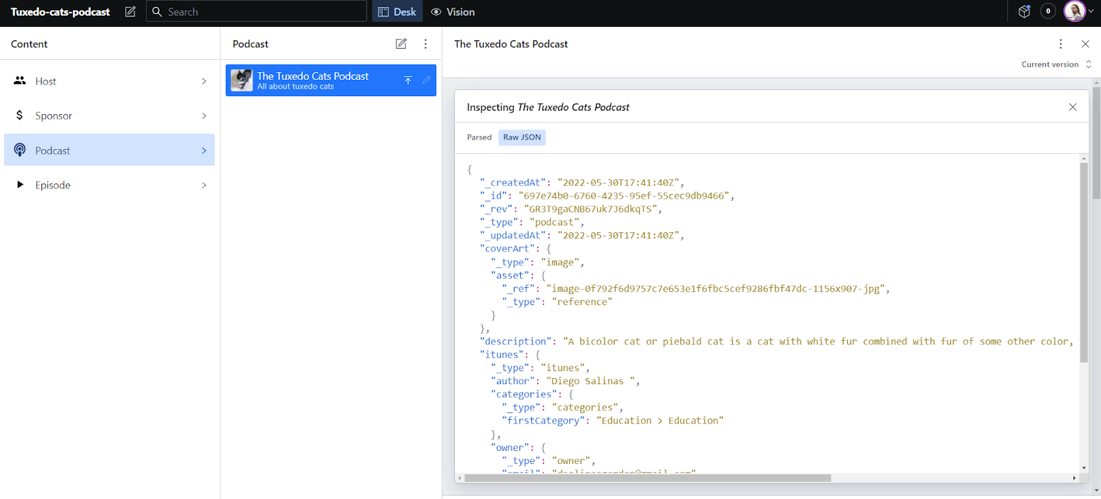 Let’s see this in Sanity Studio. Go to the “Content” tab, choose “Episode” and click on the menu at the right side of the screen. Alternatively, you can use Crtl+Alt+I to inspect the document. You should see something like this: