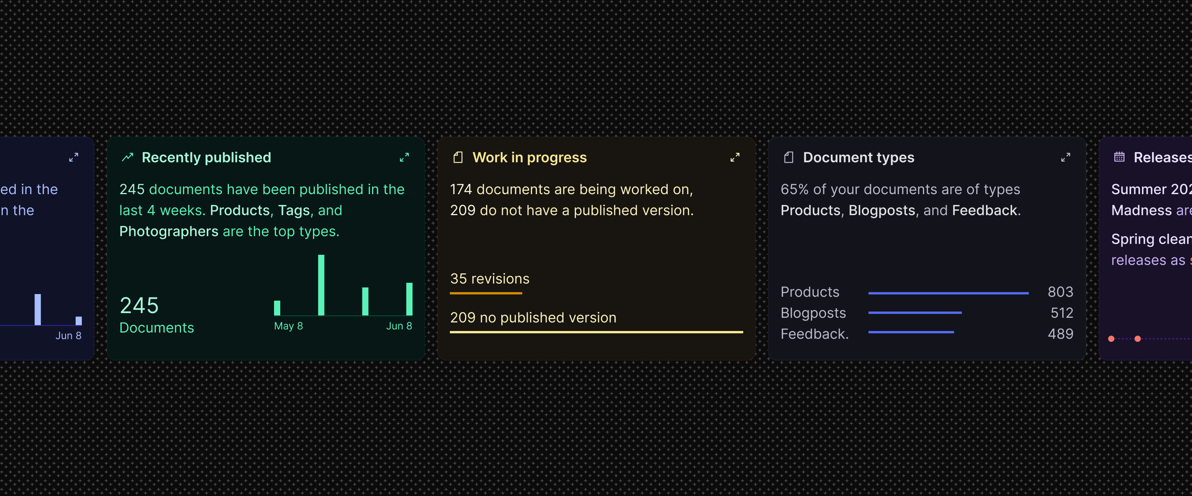 Insights is built directly into Sanity's Dashboard. No setup or configuration required - it just works.