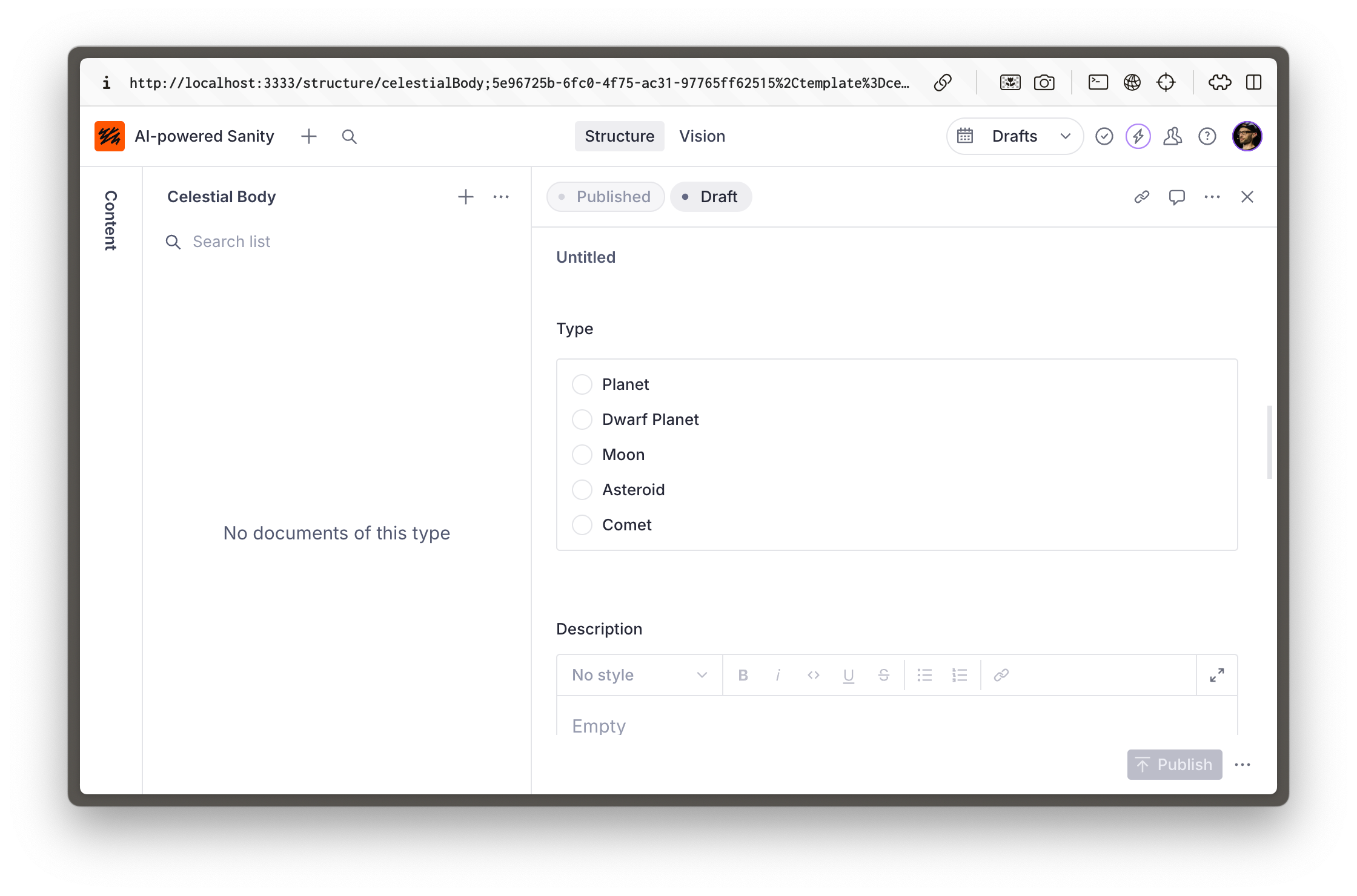 Once complete, your Sanity Studio should have a few more content types than before. Try creating a new document, yours may look something like this: