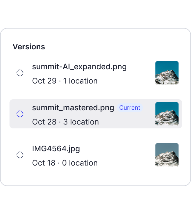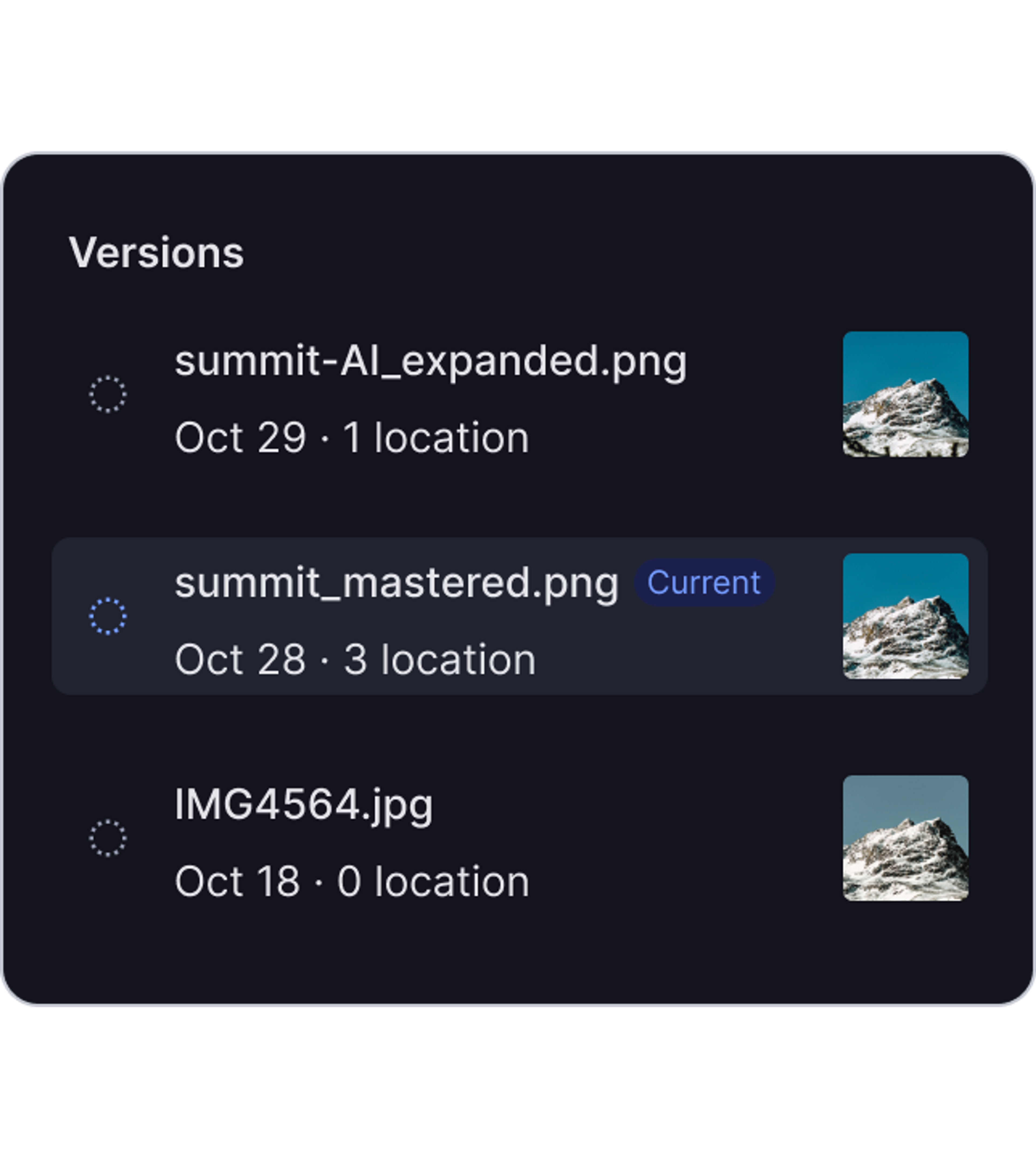 Every asset version is preserved. Upload updated product shots and push them live across all channels in one action. Need to revert? Select any previous version and make it active.