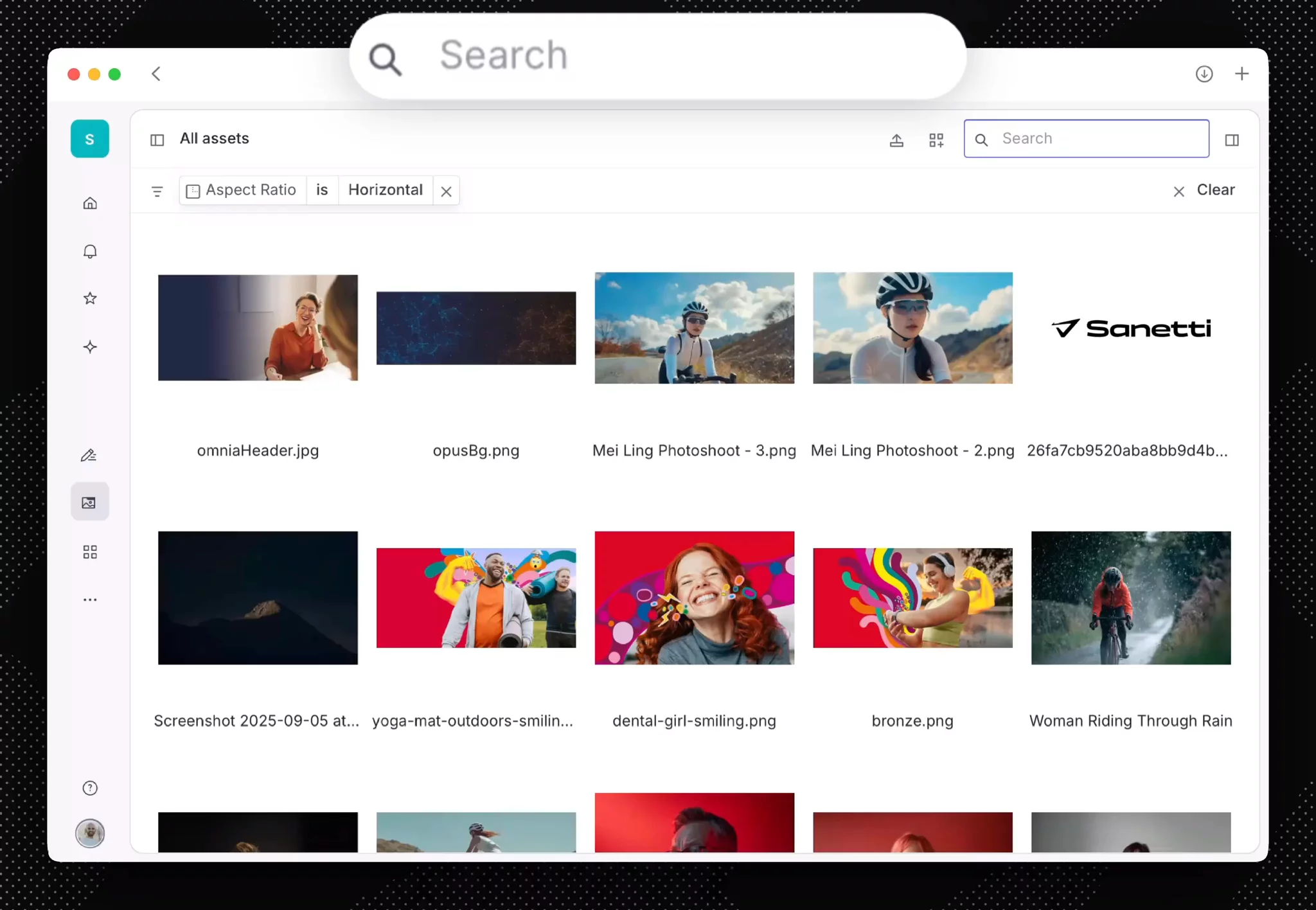 Find assets in active use, specific aspect ratios, approval status, referenced products, license, or by any other field.