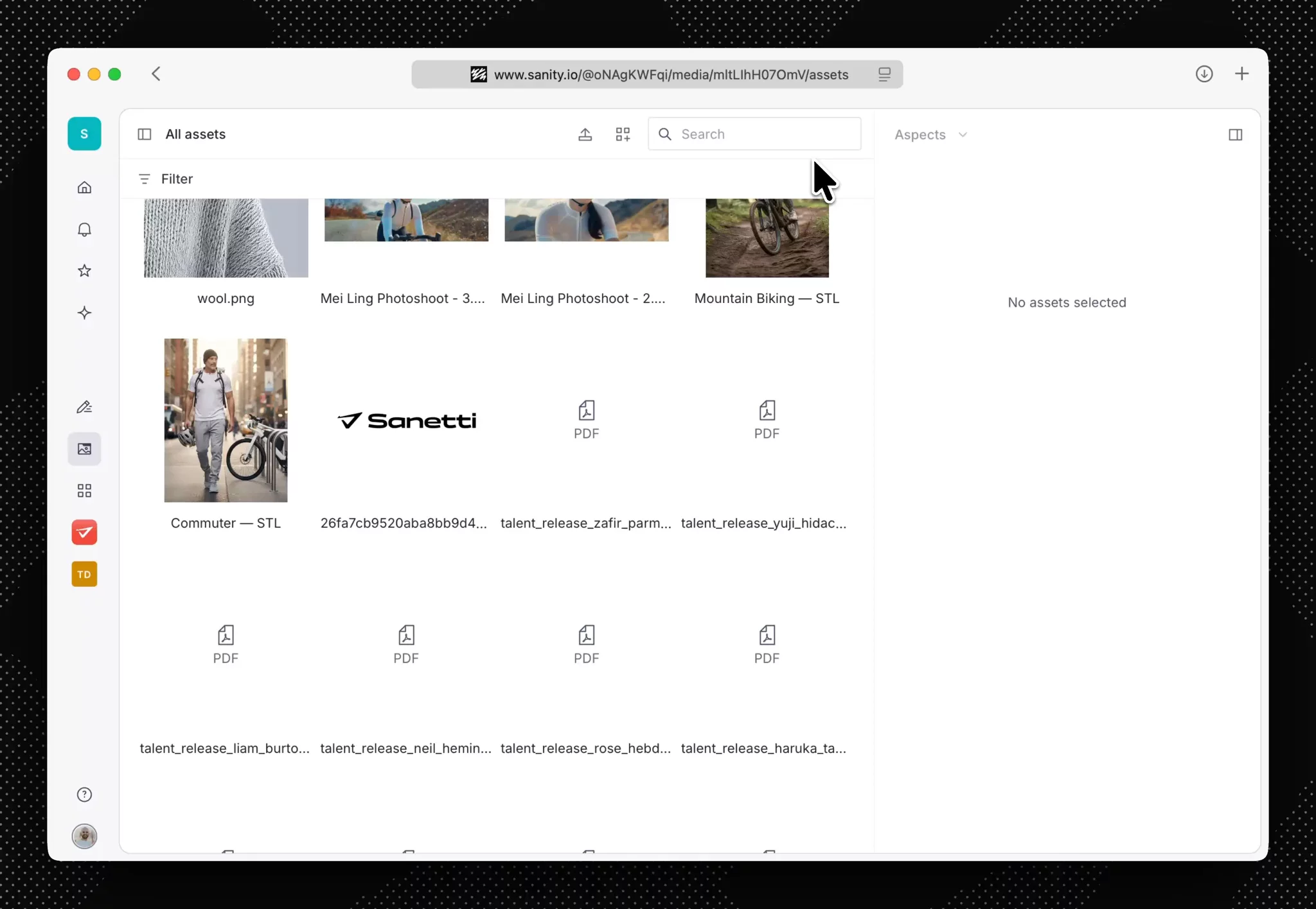 Select assets like you'd select files on your desktop. Shift-click a range, cmd-click specific ones, then bulk-update copyright info or move to a new collection.