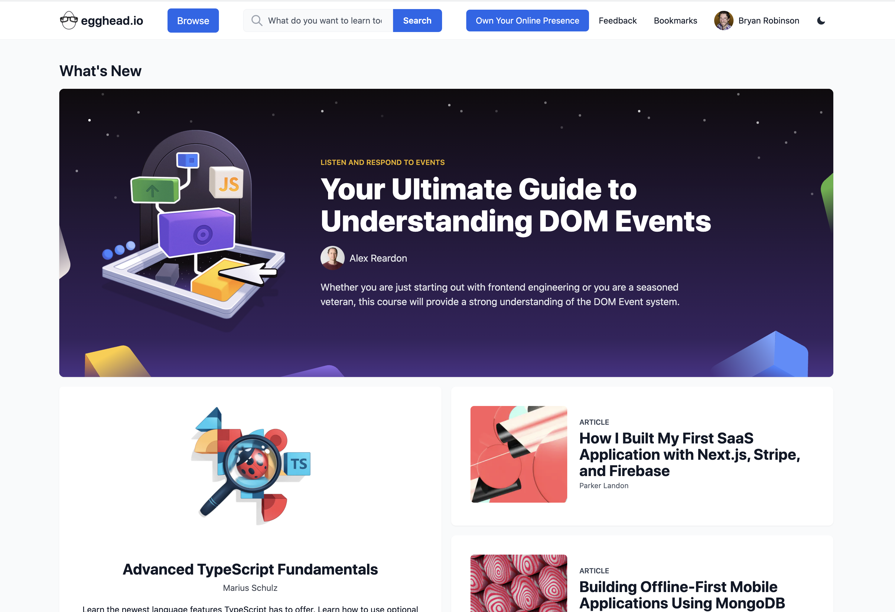 egghead.io is one of the foremost destinations for developer education on the web. The site contains a large number of filterable lessons and courses that span topics such as React, Next.js, Gatsby, 11ty, Chrome Dev Tools, and more.