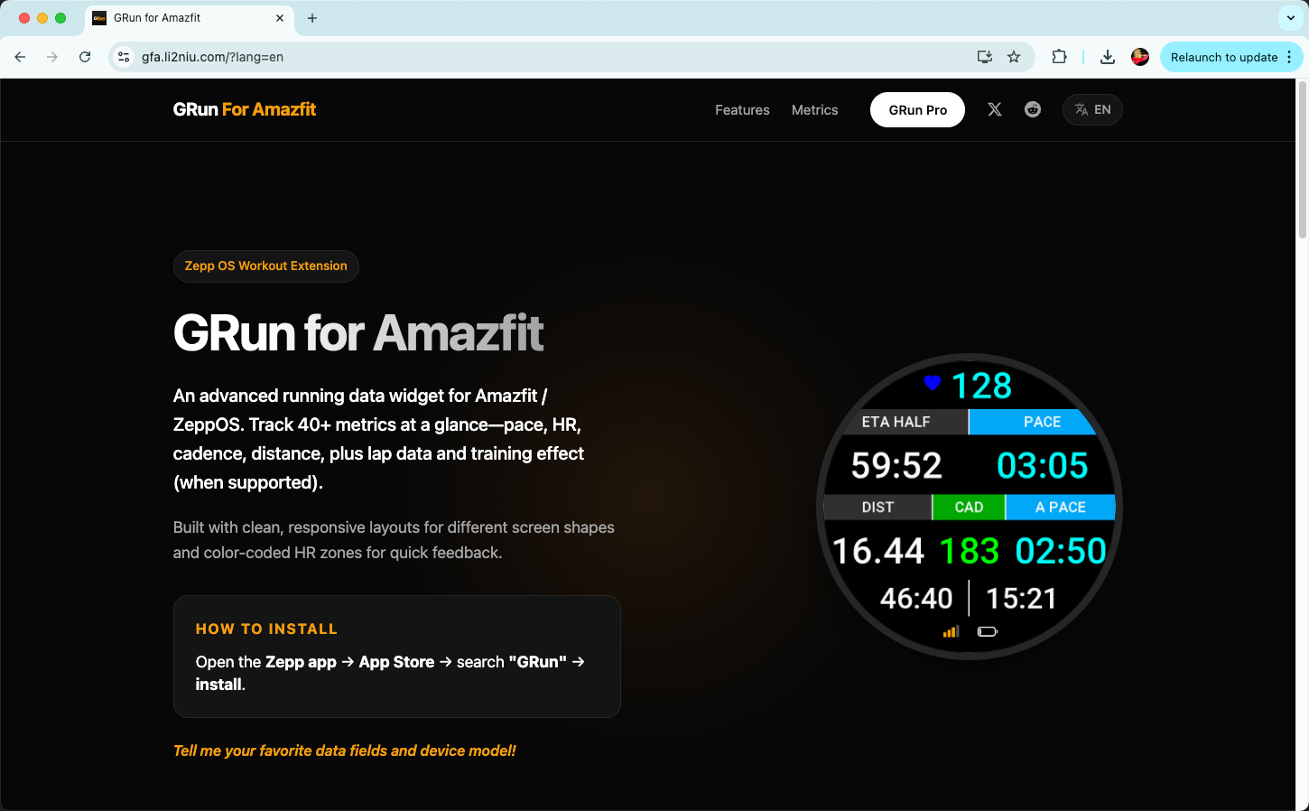 A landing page for GRun for Amazfit. GRun is a powerful workout extension for ZeppOS that brings comprehensive running data to your Amazfit watch. Inspired by the popular GRun app, this ZeppOS version provides even more data fields, including real-time metrics, complete lap data, training effects, and fully customizable displays.