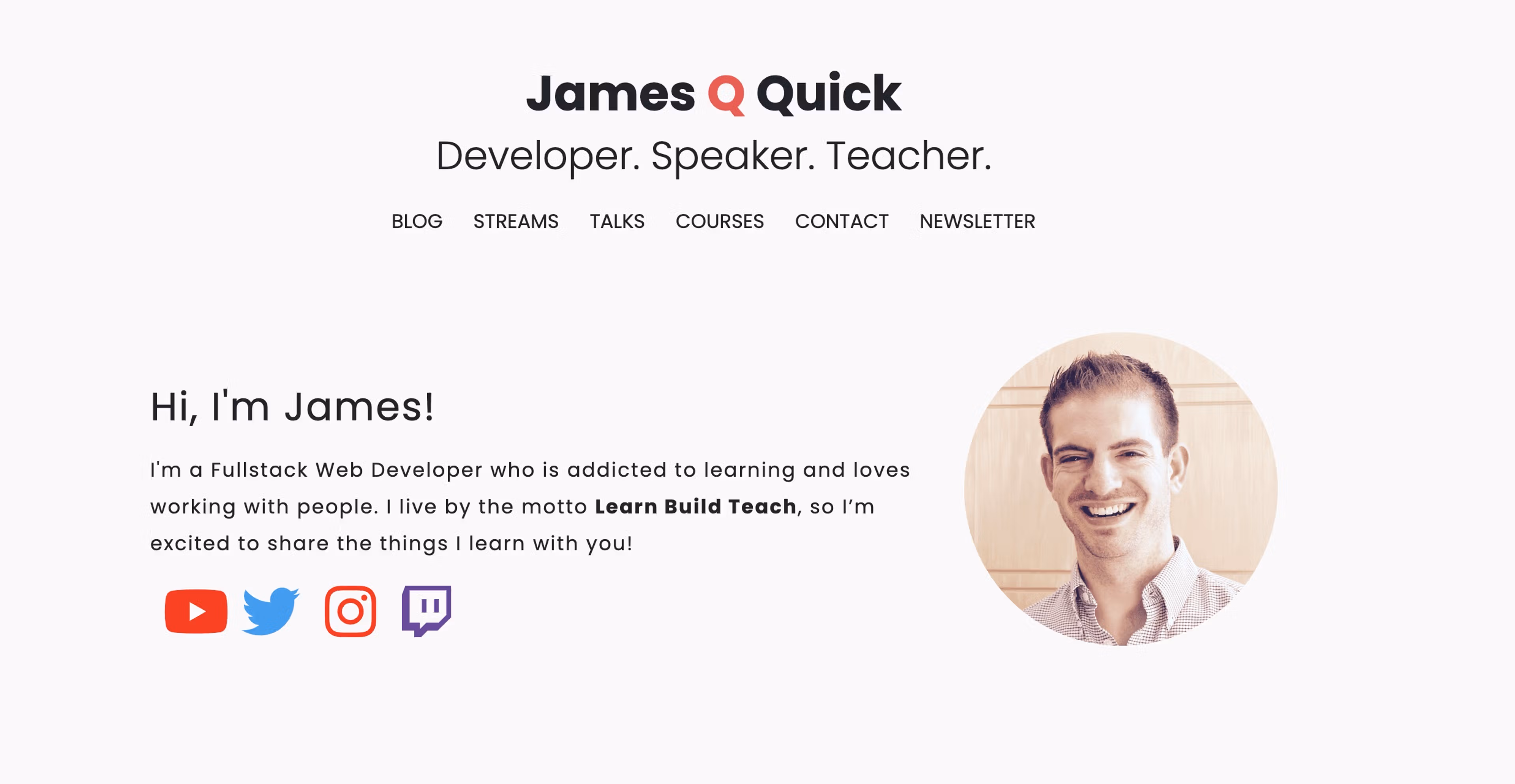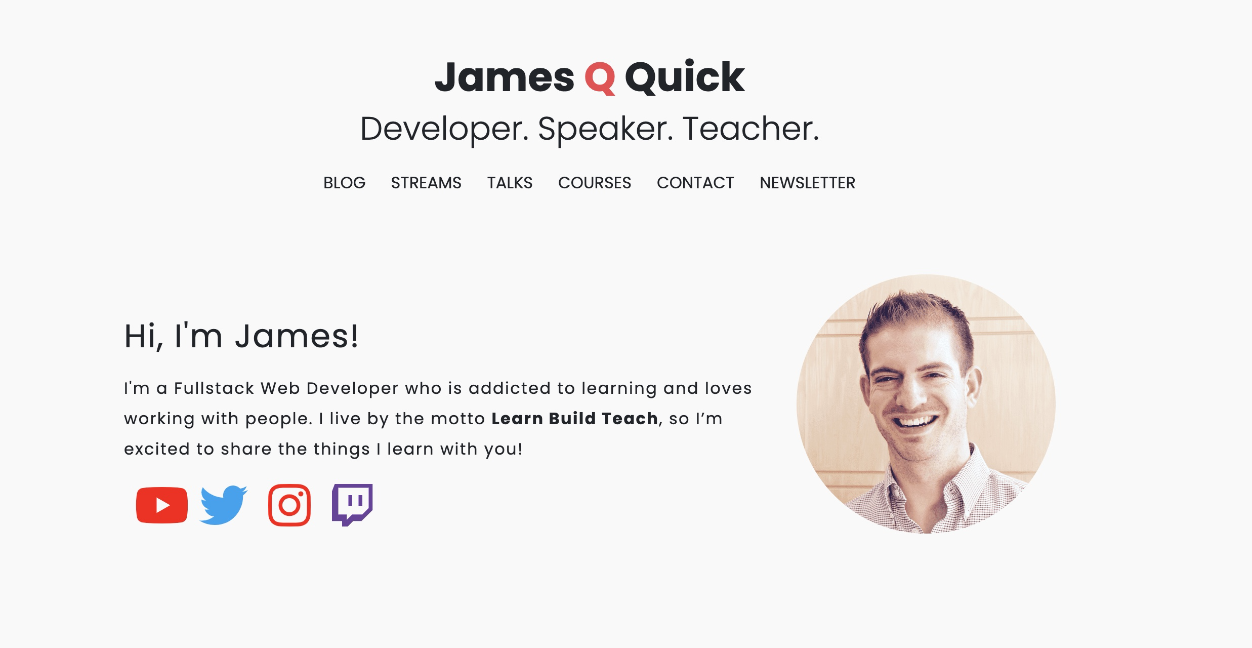 This is the personal site for James Q Quick, highlighting different types of content that are stored in Sanity: blog posts, talks, streams, YouTube videos, etc.