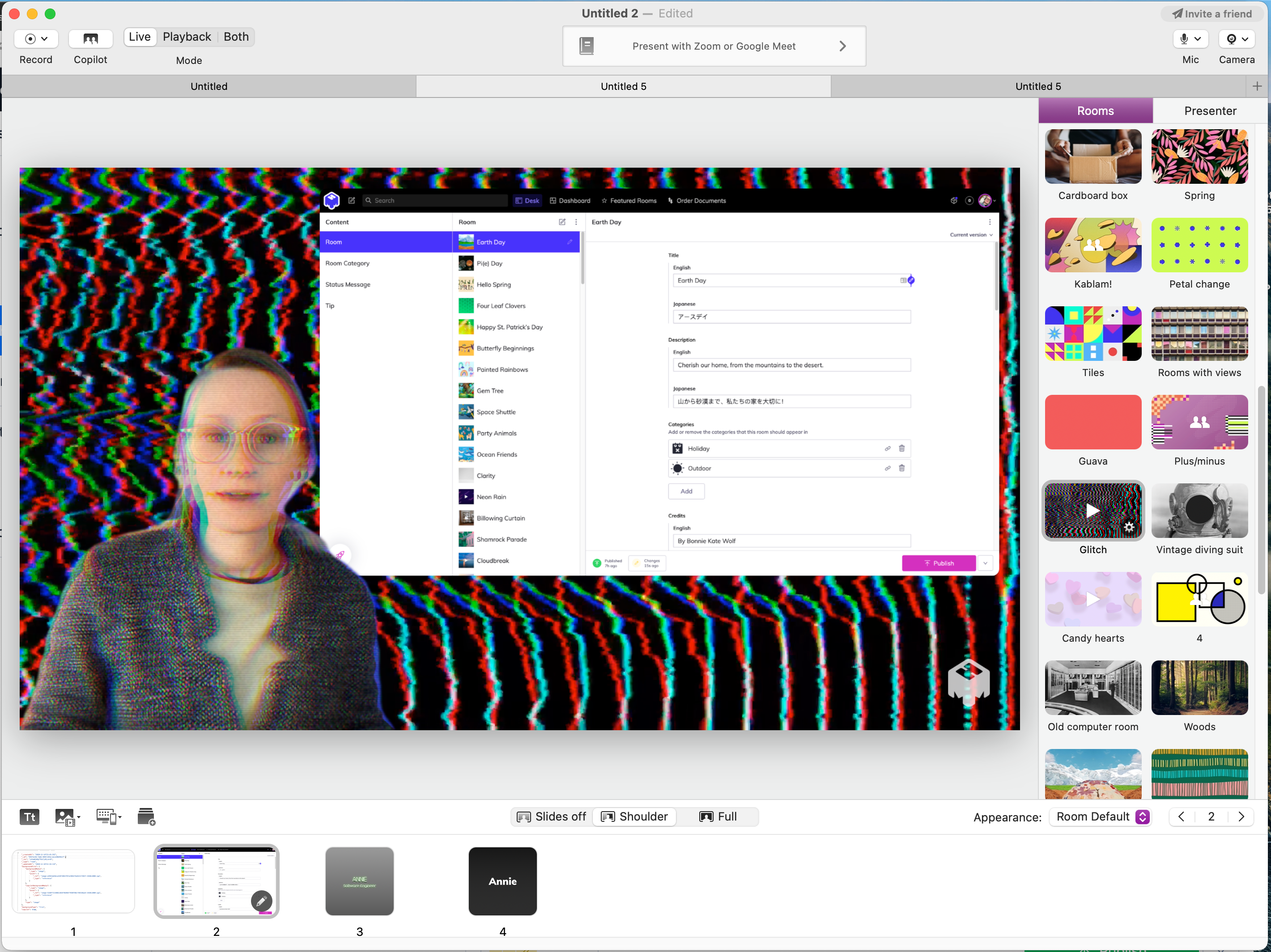Curated virtual backgrounds, known as “rooms,” are one of mmhmm’s core offerings. These images and videos are updated often, usually by talented designers, copywriters, and content managers. There are also many tooltips, announcements and UI elements that need frequent updating and translation.