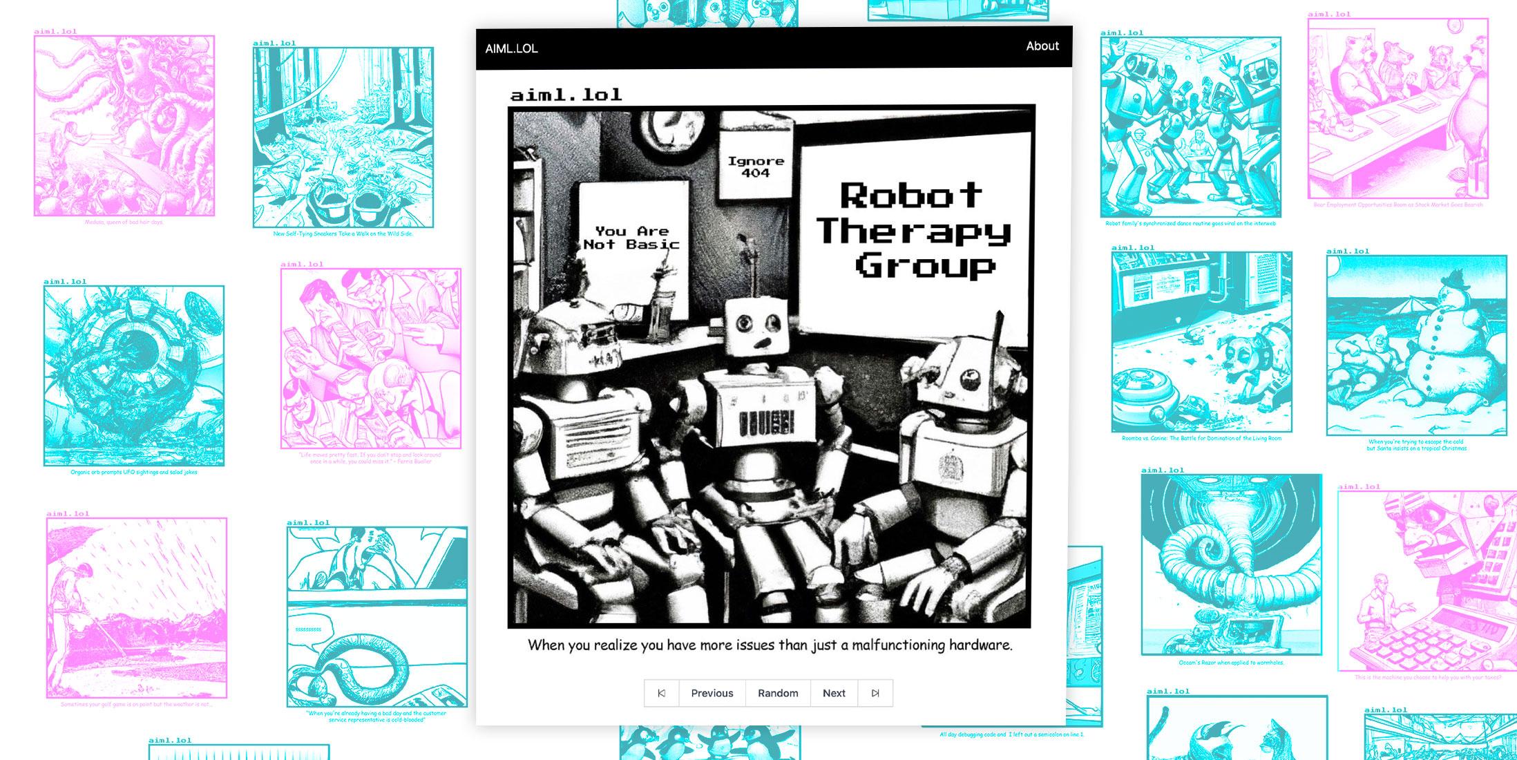 AIML.LOL is an online comic focused on 100% automated publishing via AI/ML. The AI creates images, jokes, and captions for the comics. It also generates all responses to online comments, generates its online appearance, and has written its own FAQ.