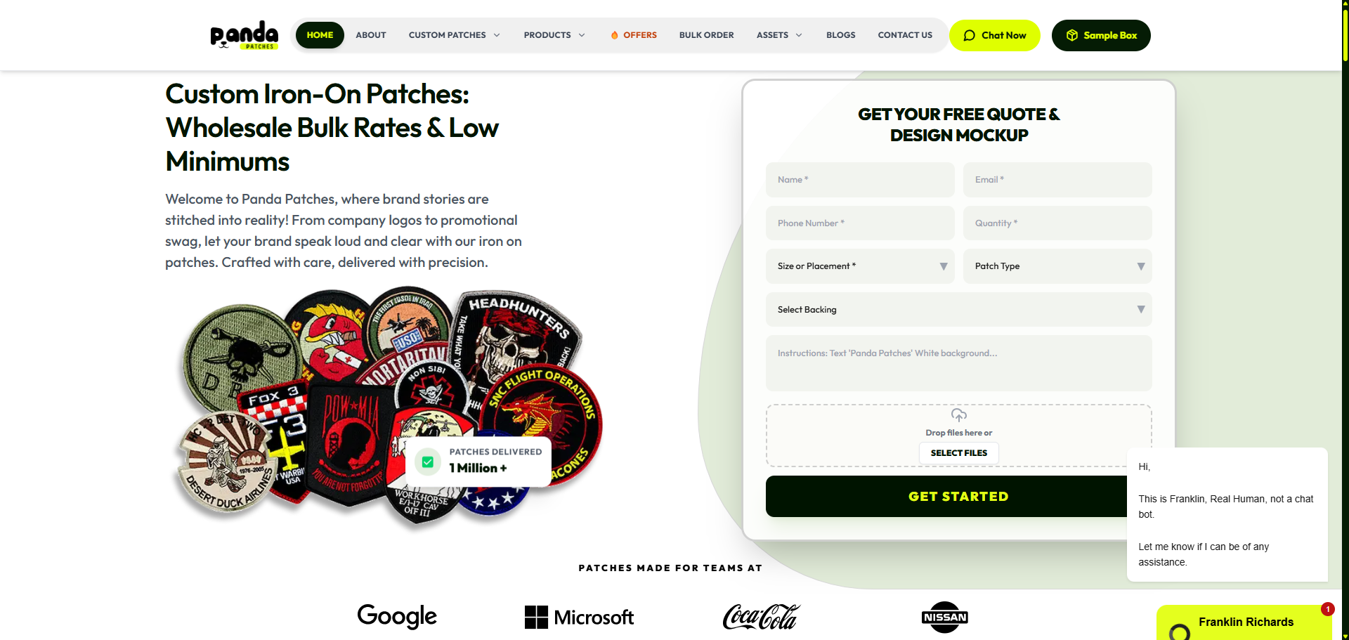 Custom embroidery and patches e-commerce store built on Next.js and Sanity CMS. Loads in under 1 second with 95+ Google PageSpeed score. Built by PandaCodeGen.
