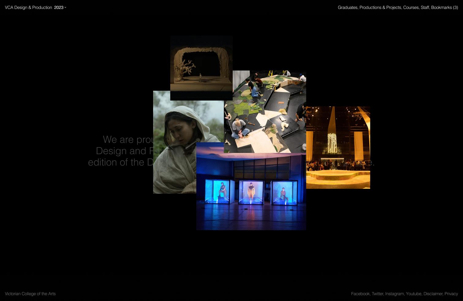 Our digital experience was to showcase a wide array of work: from studio work, to exhibitions, and performances from a range of creative disciplines, as the design and production faculty encompassed the Bachelor of Fine Arts (Production), the Bachelor of Design (Performance Design and Graphic Design), and the Master of Production Design.