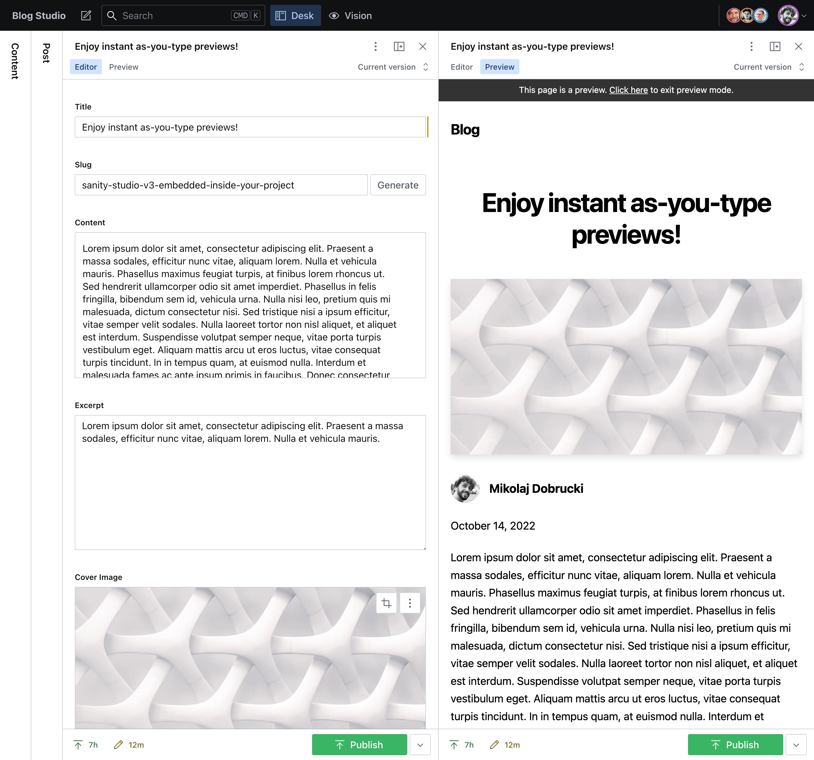 Sanity Studio enables you to create content using unique components for specific use cases, such as social media preview cards, or work with integrated tooling to orchestrate complex content workflows, such as creating localized content.